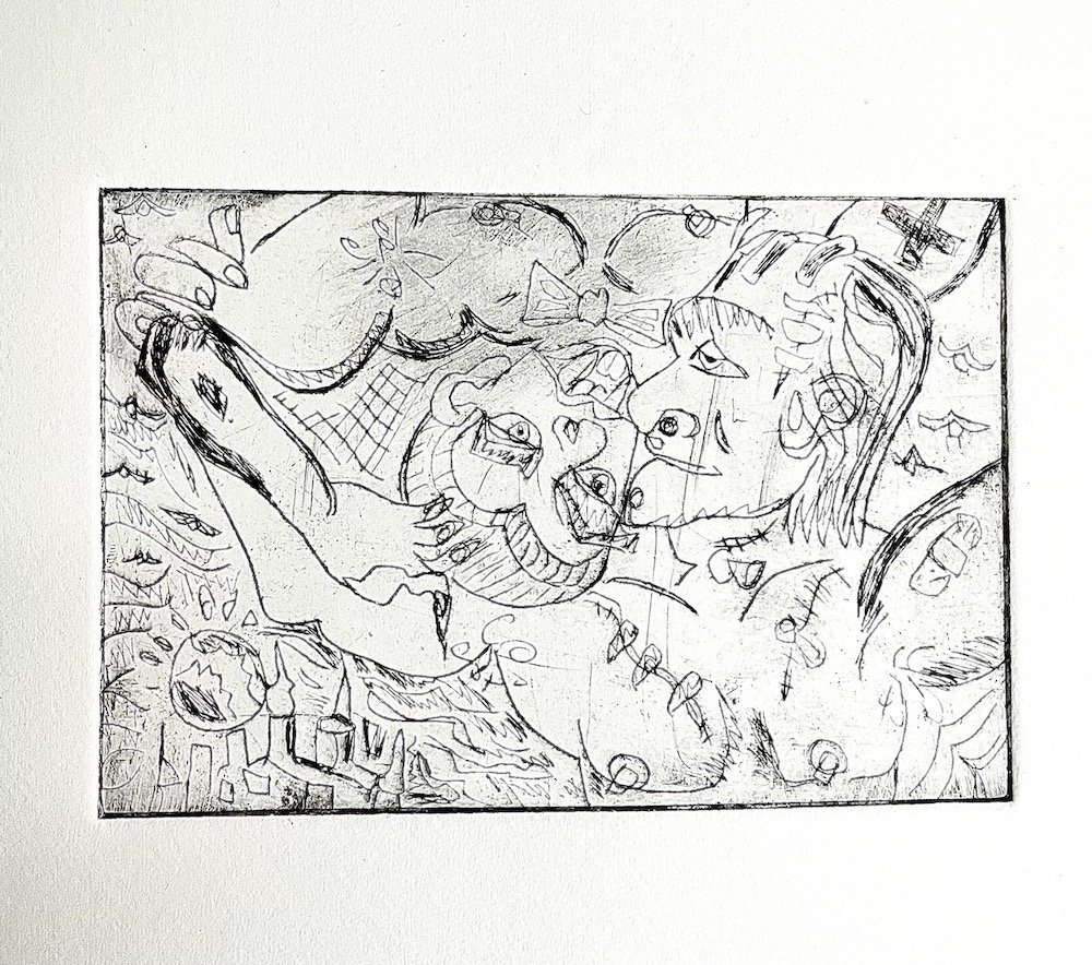 “Dracula Vs. Frankenstein” Etching on Paper, 6” W x 4” H, 2024